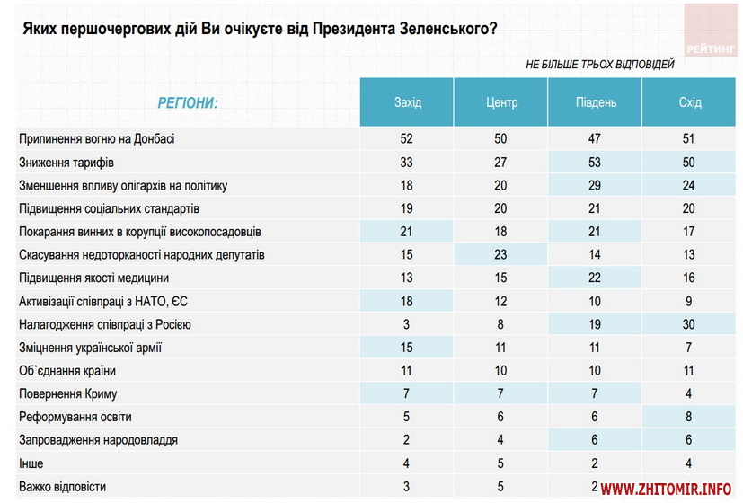 Очікування щодо припинення війни на Донбасі притаманні практично більшості респондентів в усіх макрорегіонах. З іншого боку дещо вищий рівень сподівань стосовно зниження тарифів, зменшення впливу олігархів на політику та налагодження відносин з Росією фіксується серед мешканців Півдня та Сходу. Стосовно покарання високопосадовців, винних у корупції дещо вищі очікування на Заході та Півдні, скасування недоторканності народних депутатів – у Центрі, підвищення якості медицини – на Півдні, активізації співпраці з НАТО та ЄС та зміцнення української армії – на Заході.