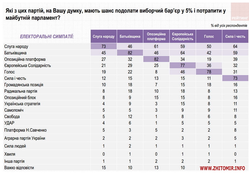 Більше половини опитаних вірять у те, що партія «Слуга народу» подолає 5% виборчий бар’єр та потрапить до майбутнього парламенту. Близько 40% говорять так про партію «Батьківщина», третина – про партію «Опозиційна платформа – За життя», чверть – партію «Європейська Солідарність», кожен п’ятий – про партію «Голос». Серед симпатиків політичних сил з відносно високим рейтингом більше 70% вірять в те, що їхні фаворити потраплять до Верховної Ради.