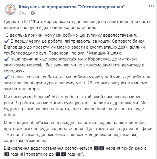 На сторінці КП «Житомирводоканал» у фейсбук 20 червня розмістили допис, у якому директор водоканалу Андрій Нікітін дає відповіді на запитання, для чого і на який час в місті відключають воду.