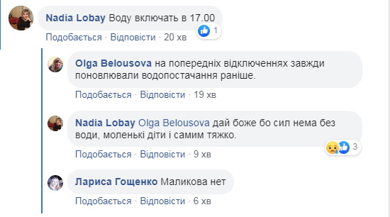 Зокрема, під запитанням «В яких районах почала з’являтися вода?» користувачки Olga Belousova у фейсбук-групі Матусі та татусі Житомира вже за півгодини з’явилися десятки коментарів, у яких користувачі переважно скаржаться на її відсутність (воду обіцяли поступово подавати з 8 ранку 22 червня). Про наявність води, але відсутність напору, повідомляють жителі нижньої Польової та гідропарку: