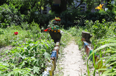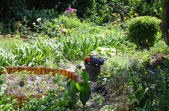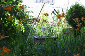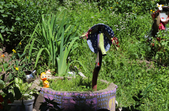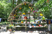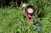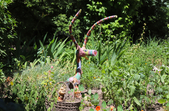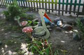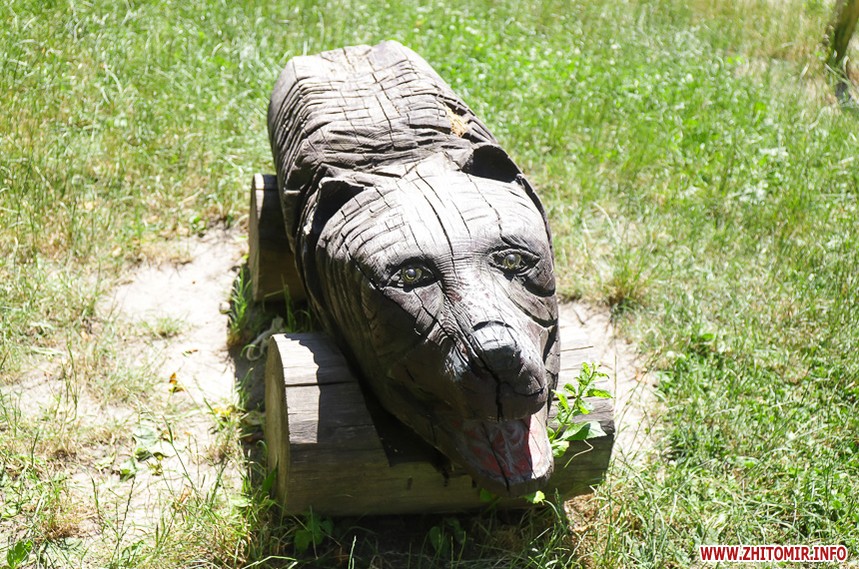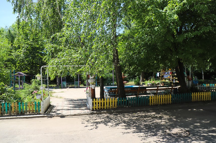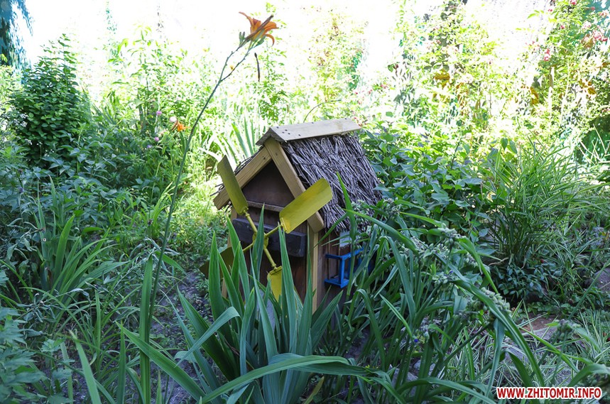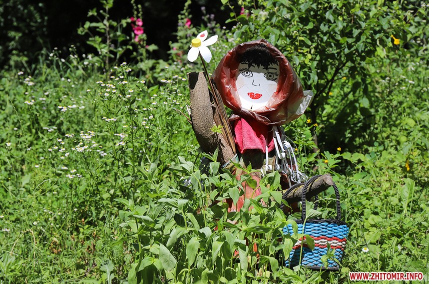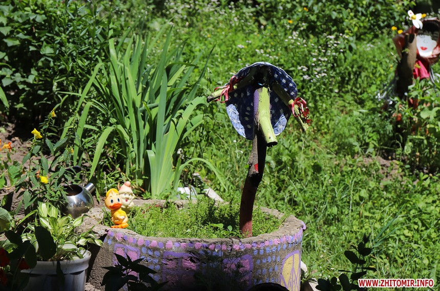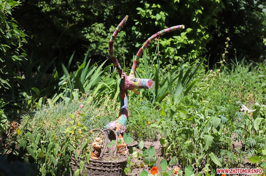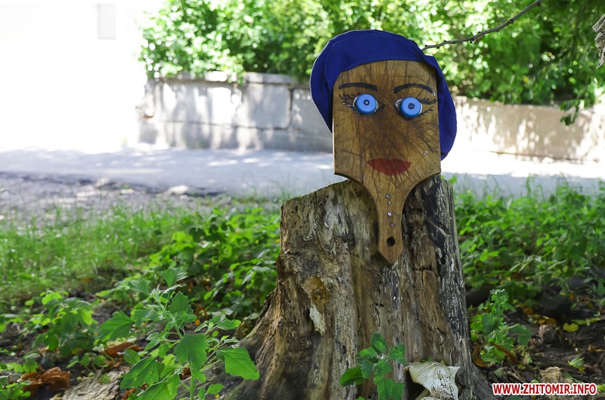 Так, у дворі будинку на вулиці Шевченка, 12-А серед літнього цвіту пристановище собі знайшли старі резинові дитячі іграшки, одне зрізане дерево перетворилося на «дівчинку» в панамці та з косичками, а інше – на кольорову антилопу. Друге життя отримала і стара кухонна дошка – вона стала «леді» з полум’яними вустами та у картузі.