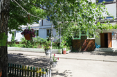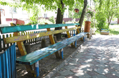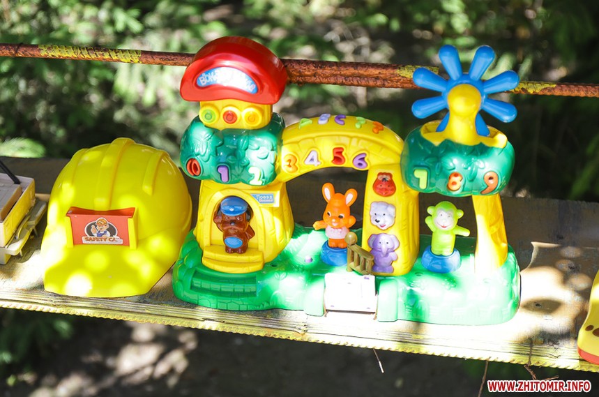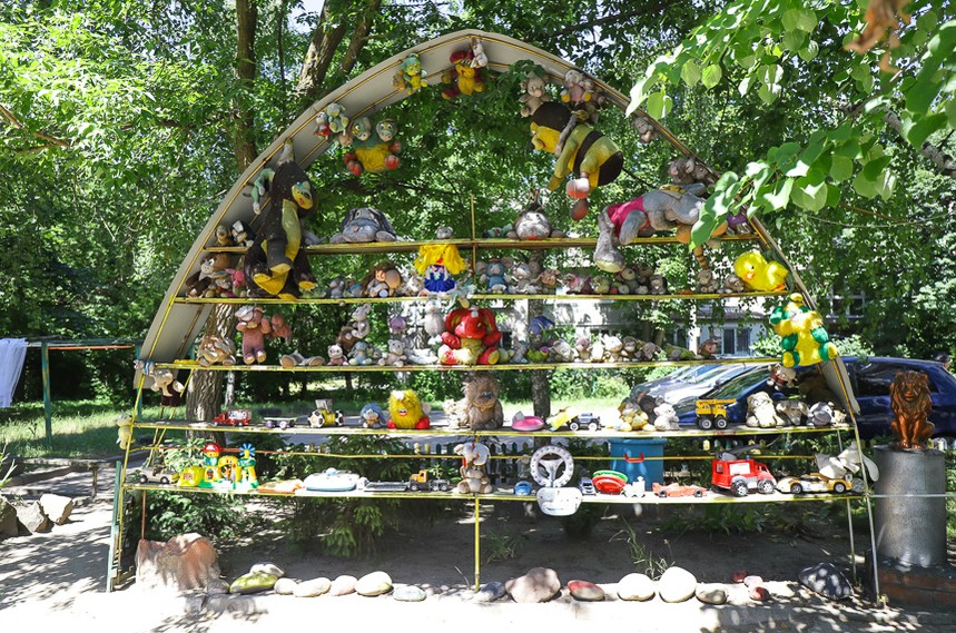 Казковим своє подвір’я зробили і мешканці будинку на Довженка, 70. Тут – справжній світ іграшок: на величезних полицях вмостилися м’які слоники, зайчики та собачки. Територію «охороняє» дерев’яний ведмідь.