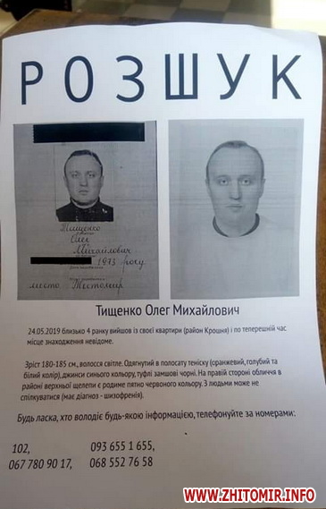 «24.05.2019, близько 4 ранку, вийшов зі своєї квартири (район Крошня), і по теперішній час місце знаходження невідоме. Зріст 180-185 см, волосся світле. Одягнутий у смугасту теніску (оранжевий, голубий та білий кольори), джинси синього кольору, туфлі замшеві, чорні. На правій стороні обличчя, в області верхньої щелепи, є родима пляма червоного кольору. З людьми може не спілкуватися (має діагноз «шизофренія»)», – йдеться в оголошенні.