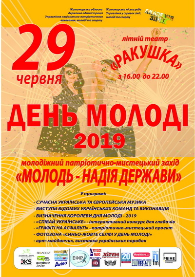 У суботу, 29 червня, у найбільшій концертній залі міста Житомира – зручному та комфортабельному літньому театрі "Ракушка" та прилеглій до нього території міського парку культури та відпочинку ім. Ю. Гагаріна краща творча молодь Житомирщини відзначатиме загальноукраїнський День молоді традиційним щорічним молодіжним патріотично-мистецьким заходом "МОЛОДЬ – НАДІЯ ДЕРЖАВИ – 2019". Дійство відбудеться завдяки зусиллям організаторів - управлінню національно-патріотичного виховання, молоді та спорту Житомирської облдержадміністрації, управлінню у справах сім'ї, молоді та спорту Житомирської міськради, молодіжних організацій, волонтерів та громадських активістів.