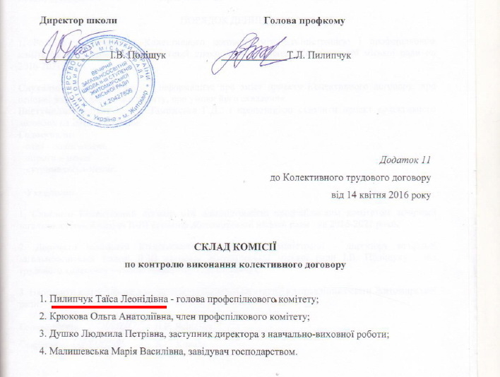 Таїса Пилипчук – голова профспілкового комітету вечірньої школи міськради, ці дані знаходимо у додатку до колективного договору між адміністрацією та профспілковим комітетом вечірньої ЗОШ ІІ-ІІІ ступенів Житомирської міської ради на 2016-2021 роки.