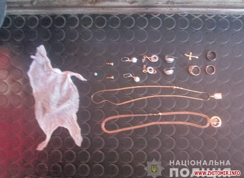 Під час поверхневого огляду вказаних осіб та їх автомобіля Ford Escort поліцейські виявили та вилучили викрадені з будинку бердичівлянки ювелірні вироби, грошові кошти та засоби, які могли слугувати знаряддям зламу.