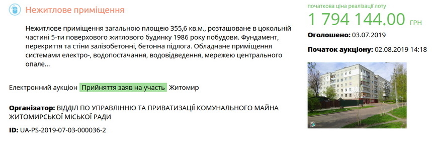 Як повідомляв Житомир.info, в червні 2019 року влада Житомира виставила на електронний аукціон п’ять приміщень: 1-2 червня два нежитлових приміщення – 133,9 кв.м. на вулиці Перемоги, 54 зі стартовою ціною 1 млн 621 тис. 53.60 грн; 20,6 кв.м. на вулиці Троянівській, 14 зі стартовою ціною 121 тис. 898.40 грн; 5 червня – 355,6 кв.м. колишнього комунального ЖЕКу №15 по вул. Юрка Тютюнника зі стартовою ціною 3 млн 588 тис. 288 грн; 6 червня – кімнату 12 кв.м. в гуртожитку на площі Польовій, 10 зі стартовою ціною 135 тис. грн; 20 червня – 244,2 кв.м. приміщення перукарні «Усмішка» на проспекті Миру, 23 зі стартовою ціною 2 млн 823 тис. 600 грн.