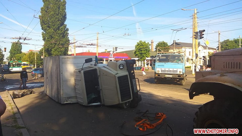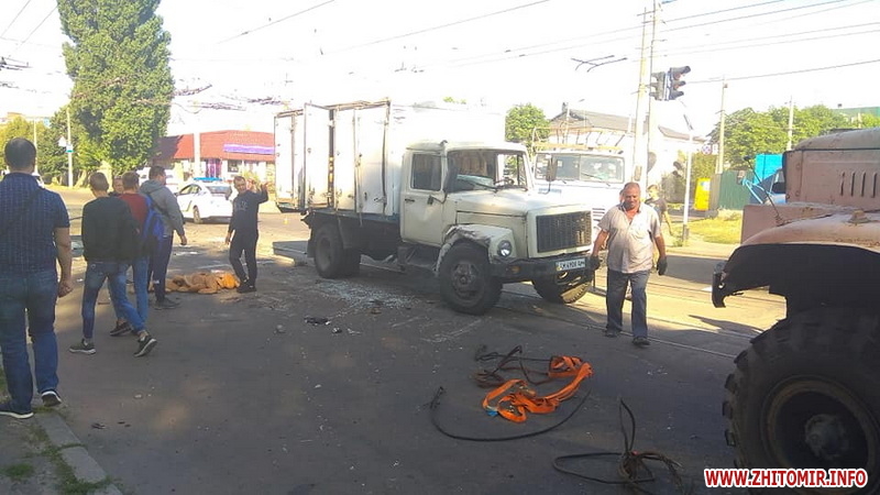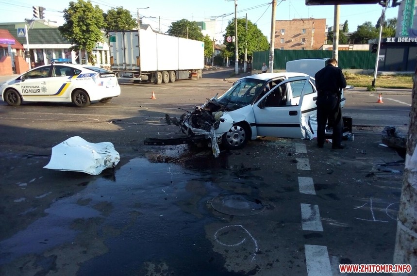 «Попередньо, водій автомобіля Opel Vectra, 25-річний житомирянин, рухаючись вул. Покровською у напрямку центру міста, на перехресті з вул. М. Грушевського допустив зіткнення з вантажівкою ГАЗ-3307 під керуванням 38-річного місцевого жителя. У результаті ДТП 25-річний пасажир автомобіля Opel загинув на місці події. Ще одного пасажира цього транспортного засобу, 25-річного місцевого жителя, з травмами було ушпиталено до реанімаційного відділення міської лікарні», – інформують у поліції.