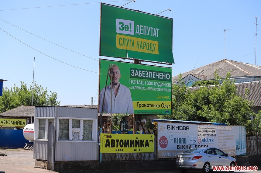 На цих виборах в Житомирі «зазеленіло»: крім незліченної реклами ЗеКоманди з партійними гаслами та портретом кандидата від «Слуги народу» Ігоря Герасименка, зелений колір для своєї агітації обрали також самовисуванці Олег Грамотенко та Борис Ткаченко. В деяких місцях реклама так розміщена, що дійсно може ввести виборця в оману.