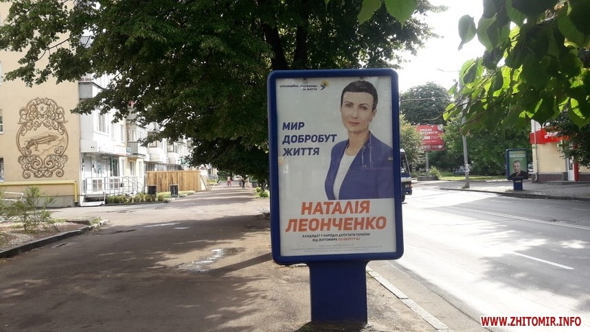 У нас на сайт 1 липня був фоторепортаж про передвиборчу рекламу в Житомирі, з того часу її стало ще більше. Зокрема, з’явилося багато агітації Наталі Леонченко, яка змінила Опозиційний блок на таку ж платформу і балотується від партії, де прізвища першої п’ятірки: Бойко-Рабінович-Медведчук-Королевська-Льовочкін. Але партійний логотип на сіті-лайтах майже непомітний.
