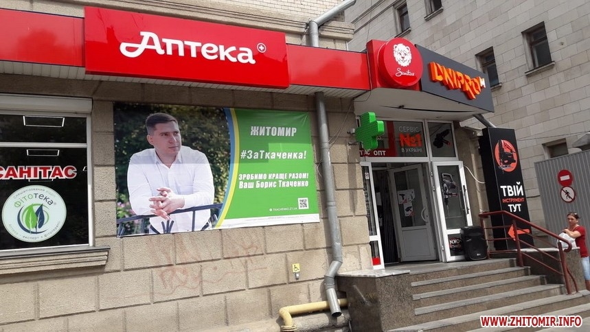 До речі, банер на фасаді й теж по вулиці Київській є й у самовисуванецm Ткаченка. Не впевнена, що ця зовнішня реклама у вигляді банерів має дозволи на розміщення, й переконана, що міська влада чи інспекція з благоустрою не буде цим перейматися.