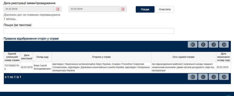 Цей позов розглядатиме суддя Сергій Вовк, який працює в Печерському райсуді столиці з 2006 року. Він був головуючим суддею у справі стосовно Юрія Луценка і засудив його до чотирьох років позбавлення волі. У 2019 Сергій Вовк визнав факт безперервного проживання Михайла Саакашвілі в Україні протягом 5 років. Це дозволило Саакашвілі балотуватися до Верховної Ради.