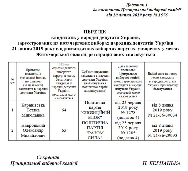 По Коростенському округу №64 відмовилася балотуватися висуванка партії «Опозиційний блок» Тетяна Баранівська, яка була зареєстрована кандидатом в останній день реєстрації – 25 червня 2019 року.