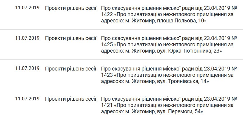 Як повідомляв Житомир.info, в червні 2019 року влада Житомира виставила на електронний аукціон п’ять приміщень: 1-2 червня два нежитлових приміщення – 133,9 кв.м. на вулиці Перемоги, 54 зі стартовою ціною 1 млн 621 тис. 53.60 грн; 20,6 кв.м. на вулиці Троянівській, 14 зі стартовою ціною 121 тис. 898.40 грн; 5 червня – 355,6 кв.м. колишнього комунального ЖЕКу №15 по вул. Юрка Тютюнника зі стартовою ціною 3 млн 588 тис. 288 грн; 6 червня – кімнату 12 кв.м. в гуртожитку на площі Польовій, 10 зі стартовою ціною 135 тис. грн; 20 червня – 244,2 кв.м. приміщення перукарні «Усмішка» на проспекті Миру, 23 зі стартовою ціною 2 млн 823 тис. 600 грн.