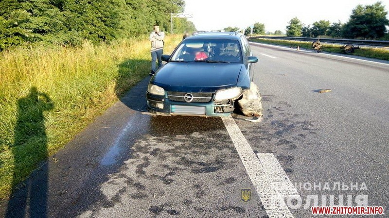 Попередньо встановлено, що на 252 км автодороги Київ-Чоп, поблизу с. Піщів Новоград-Волинського району, відбулося зіткнення автомобіля Opel Corsa під керуванням 35-річного львів’янина з гужовим возом, керманич якого здійснював розворот у невстановленому місці. Легковик з’їхав у кювет. А на коня повозки здійснив наїзд водій Opel Omega, 34-річний житель Львівщини, який рухався з учасниками пригоди у попутному напрямку.