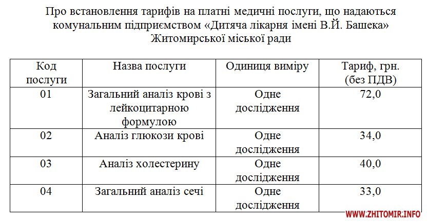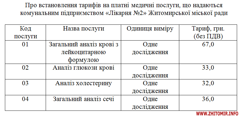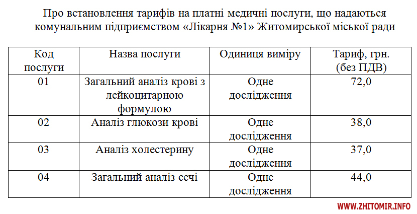 Виконком затвердив тарифи на платні медичні послуги, що надаються трьома медичними комунальними підприємствами Житомирської міської ради.