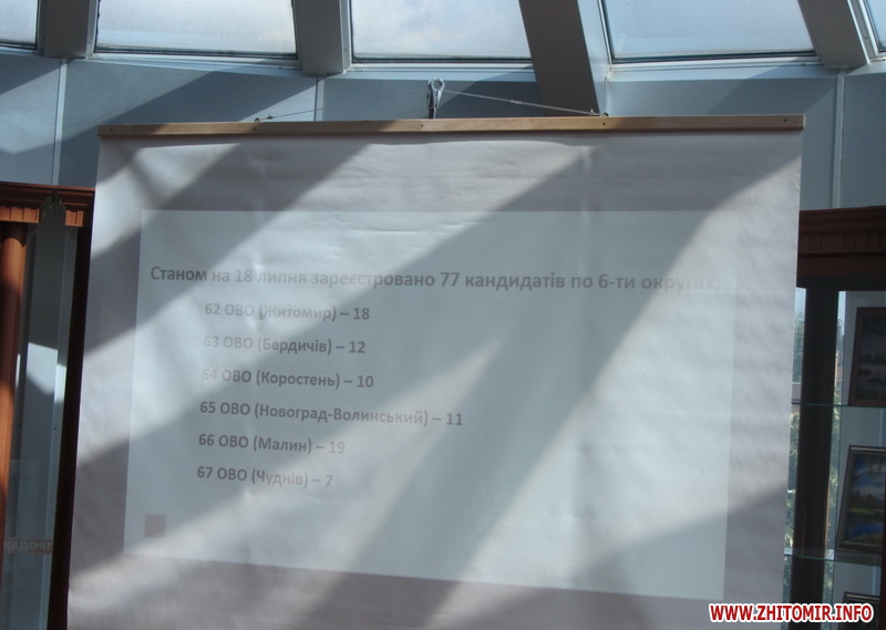 Як повідомляв Житомир.info, на момент завершення ЦВК реєстрації в шести одномандатних округах Житомирської області було 76 кандидатів, станом на ранок 11 липня залишилося 74 кандидати: 44 самовисуванці та 30 від політичних партій. Найбільше кандидатів у Малинському ОВО №66 (19) та у Житомирському ОВО №62 (18). В Коростенському ОВО №64 та Новоград-Волинському ОВО №65 будуть бюлетені з позначкою «вибув».