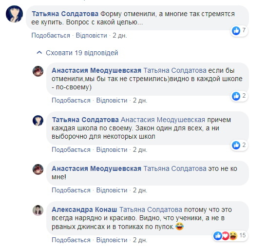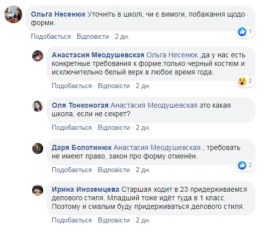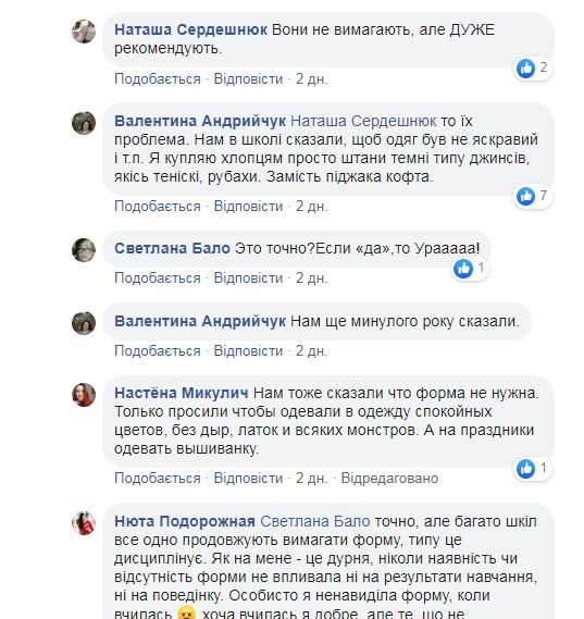 Відміна шкільної форми викликала хвилю обговорень. Зокрема, у фейсбук-групі «Матусі та татусі Житомира» під дописом-запитанням, де краще придбати шкільну форму для хлопчика, більше 80 коментарів як щодо крамниць, так і з приводу відміни/невідміни форми: