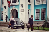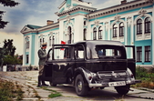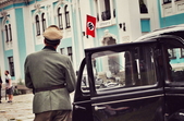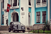 Біля центрального входу музею вивісили прапор Нацистської Німеччини, поруч – довоєнний автомобіль.