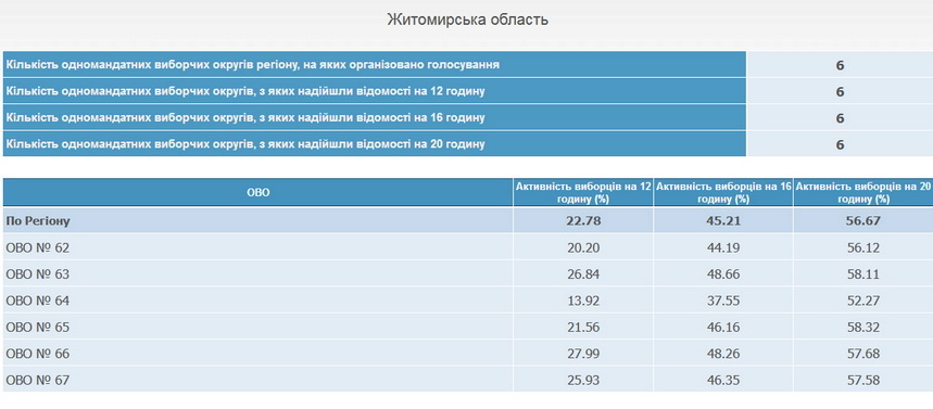 Цікаво, що на минулих парламентських виборах 26 жовтня 2014 року станом на 12:00 по Житомирській області проголосували 22,78% виборців, а Коростенський округ №64 був найменш активним.