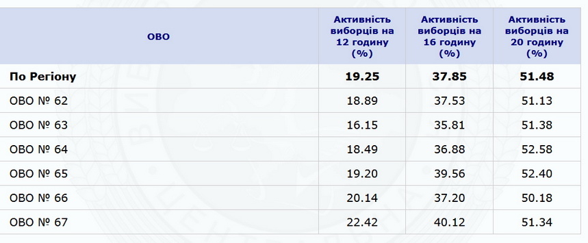 Нагадаємо, станом на 16:00 за даними ЦВК у Житомирській області явка виборців становила 37,86%: найактивніше голосували в Чуднівському окрузі №67 – 40.12% та Новоград-Волинському окрузі №65 – 39.63%, найменш активними були виборці Бердичівського округу №63 – 35,81%.