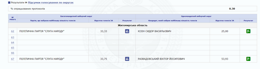21 липня близько 23.00 Центральна виборча комісія почала оприлюднювати перші результати голосування у Житомирській області. Нині опрацьовано по області лише 0,3% протоколів.