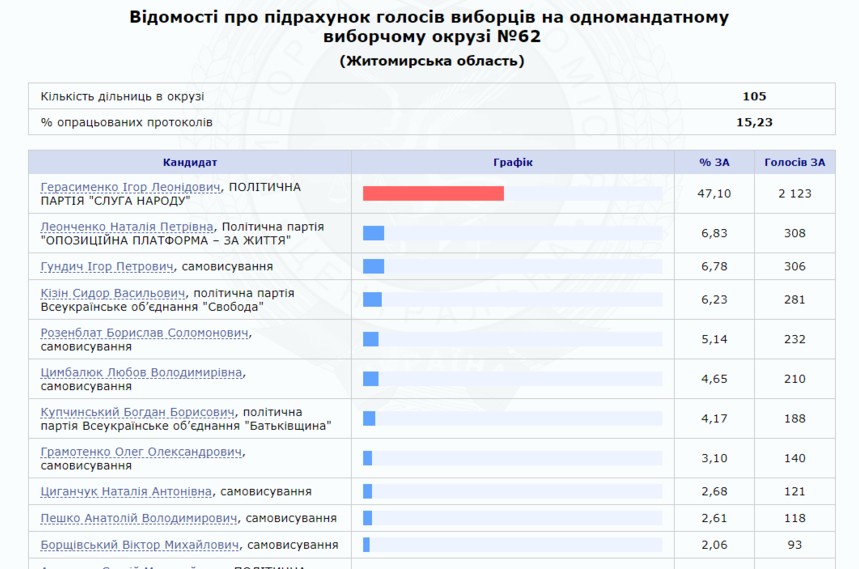По ОВК №62 (м. Житомир) опрацьовано 15,2%. За їхніми даними, з великим відривом перемагає Ігор Герасименко, за якого проголосували 47,0% виборців, на другому місці Ігор Гундич – 6,83%, на третьому місці Наталія Леонченко – 6,78% голосів.