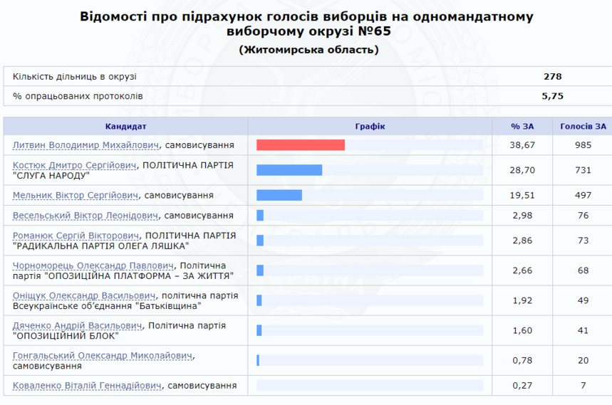По ОВК №65 (Новоград-Волинський) опрацьовано 5,75% протоколів: лідирує Володимир Литвин – 38,67%, Дмитро Костюк – 28,7%, Віктор Мельник – 19,5%.