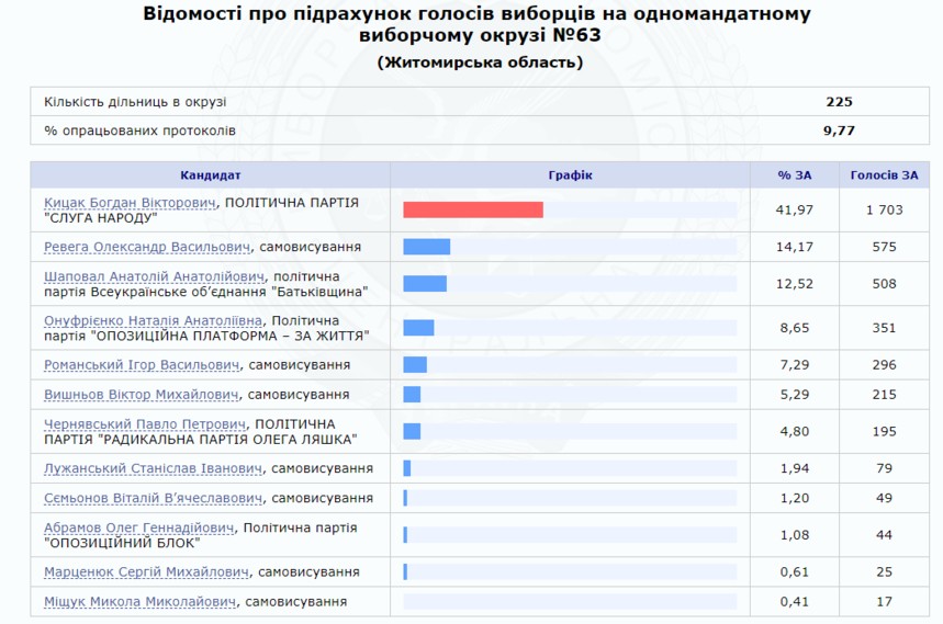 По ОВК №63 (Бердичів) опрацьовано 9,77% протоколів: лідирує Богдан Кицак – 41,9%, Олександр Ревега – 14,1%, Анатолій Шаповал – 12,5%.