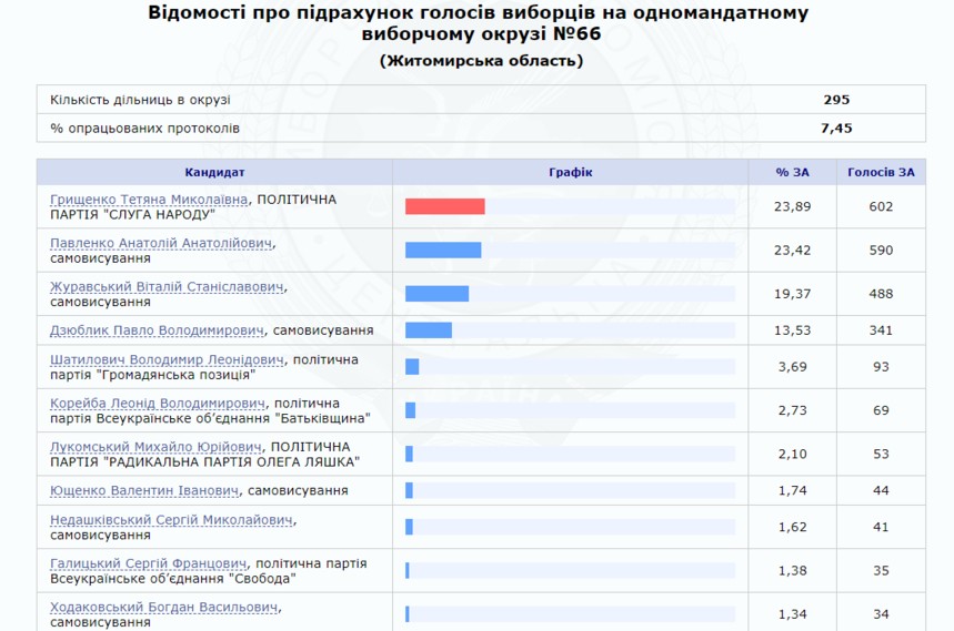 По ОВК №66 (Малин) опрацьовано 7,45 % протоколів: лідирує Тетяна Грищенко – 23,9%, її наздоганяє Анатолій Павленко – 23,4%, Віталій Журавський – 19,4%.