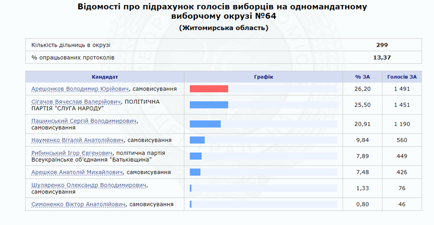 По ОВК №64 (Коростень) опрацьовано 13,37% протоколів: лідирує Володимир Арешонков – 26,2%, його наздоганяє Вячеслав Сігачов– 25,5%, Сергій Пашинський – 20,9%.