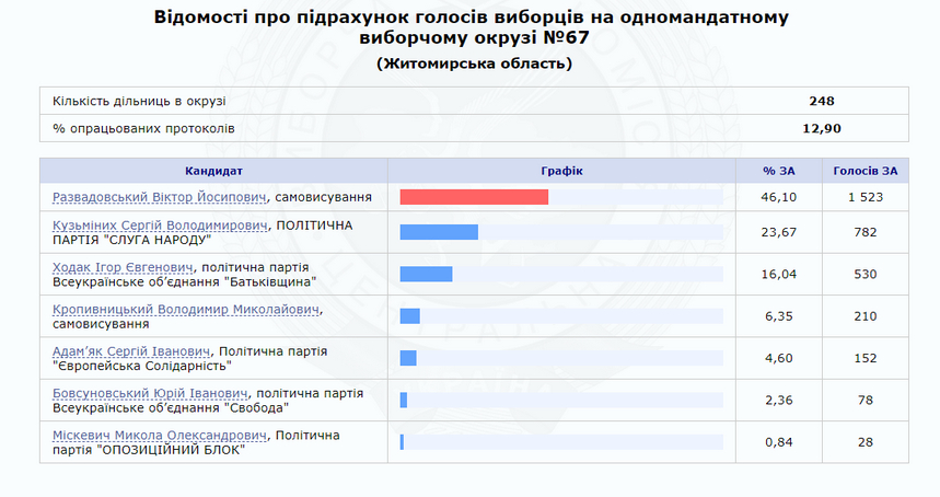 По ОВК №67 (Чуднів) опрацьовано 12,9% протоколів: лідирує Віктор Развадовський – 46,1%, Сергій Кузьміних – 23,7%, Ігор Ходак – 16,0%.
