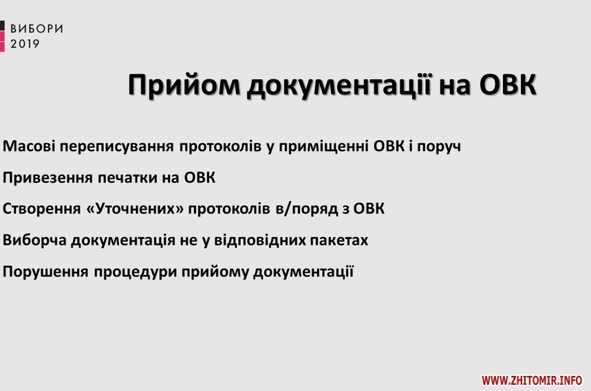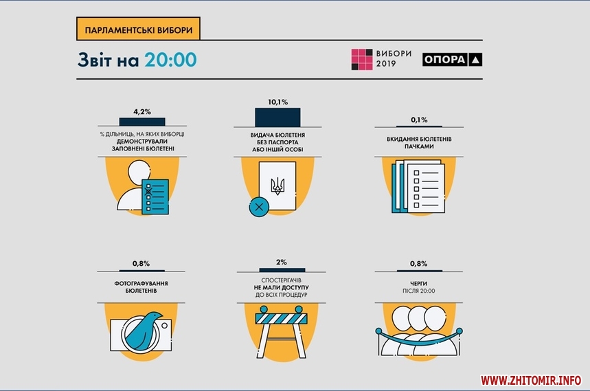 У день голосування спостерігачами ОПОРИ у Житомирській області було зафіксовано понад 200 випадків порушення законодавства: нестача скриньок для голосування, процедурні порушення членами ДВК, фізичне перешкоджання роботі спостерігача та підробка виборчого документу.