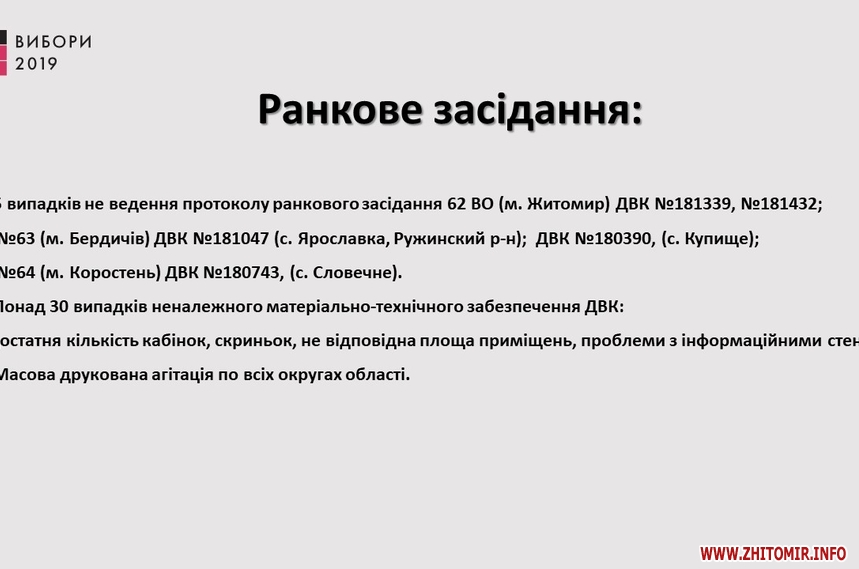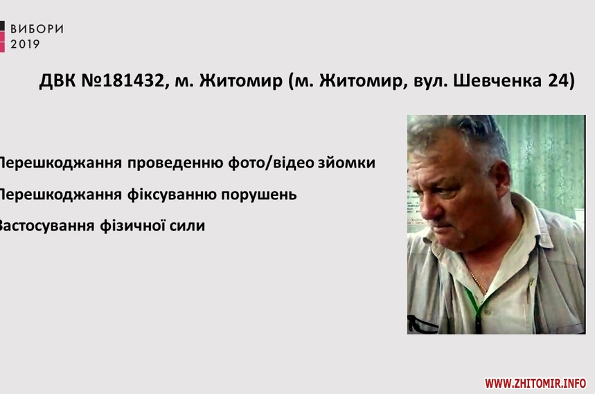 Нагадаємо, у Житомирському ОВО №62 на дільниці №181432 голова дільничної виборчої комісії Василь Стужук в грубій словесній формі забороняв спостерігачці ОПОРИ знімати відео, а потім штовхнув дівчину. В області одна дільниця не закрилася після 20.00, а на іншій члени ДВК підписали чисті протоколи.