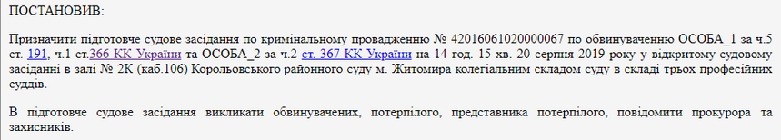 «До провадження судді Корольовського районного суду м. Житомира Аксьонова В.Є. надійшов обвинувальний акт з додатками по кримінальному провадженню № 42016061020000067 по обвинуваченню ОСОБА_1 за ч.5 ст. 191, ч.1 ст.366 КК України та ОСОБА_2 за ч.2 ст. 367 КК України», - йдеться в тексті ухвали суду, якою постановив проведення підготовчого засідання по даній справі.