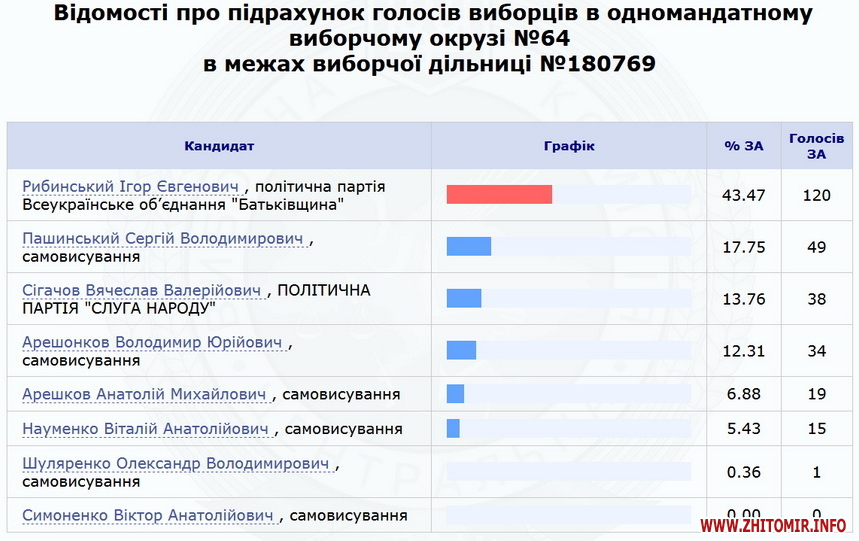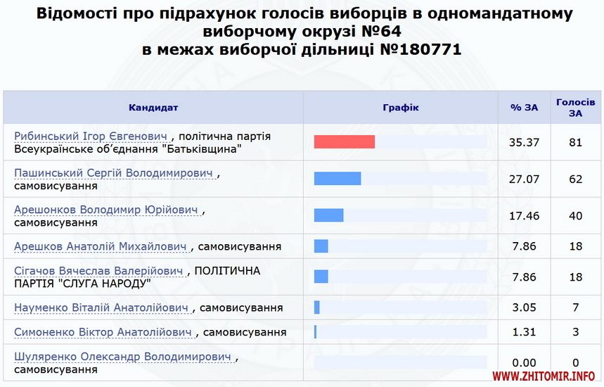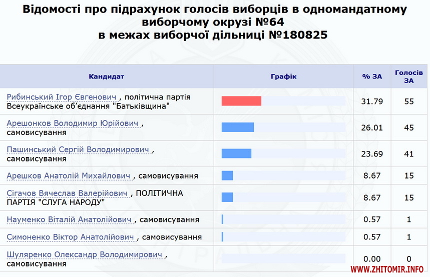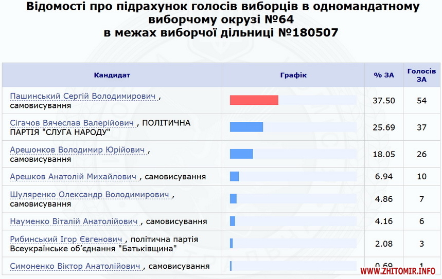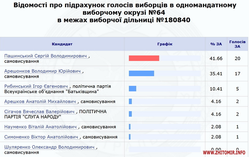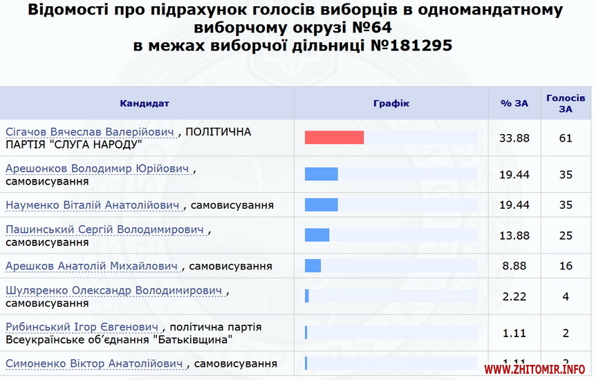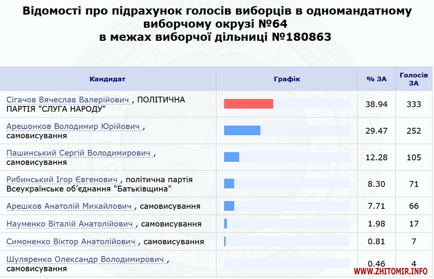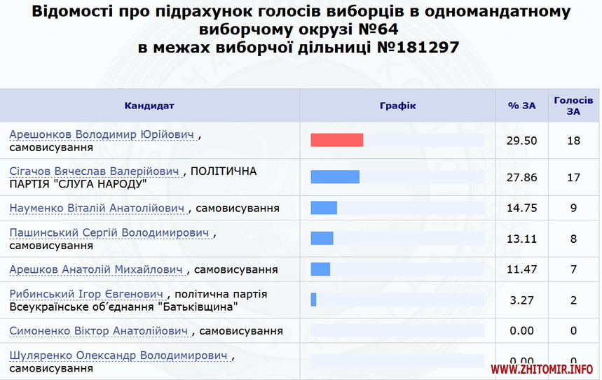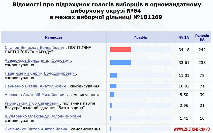 Нагадаємо, 23 липня ЦВК оприлюднила результати 100% протоколів по Коростенському округу №64 – з перевагою в менш ніж 700 голосів перемагає чинний нардеп Володимир Арешонков. Кандидат від партії «Слуга народу» Вячеслав Сігачов заявив, що вимагатиме перерахунку голосів на деяких дільницях, та розповів про погрози.