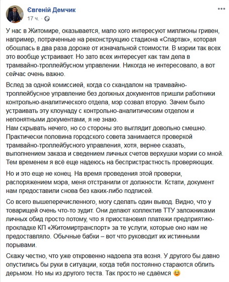 Нагадаємо, 15 липня 2019 року в прес-центрі міської ради відбулося засідання наглядової ради комунального підприємства «Житомирське трамвайно-тролейбусне управління», члени якого проголосувала за доручення контрольно-аналітичному відділу провести перевірку в ТТУ. 17 липня в ТТУ сталася суперечка між керівництвом підприємства та аудиторами міської ради, які прийшли перевіряти документацію. 19 липня після 14:00 мер Житомира на своїй сторінці у Facebook заявив, що «через раптову хворобу директора ТТУ» довелося відкласти підписання угоди з ЄБРР щодо отримання 2 млн євро грантових коштів. У відповідь Євгеній Демчик, не добираючи слів, звинуватив мера у брехні.
