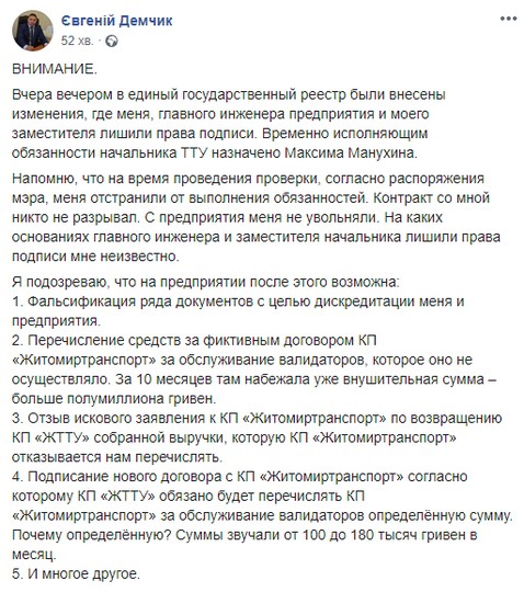 Свою точку зору щодо конфлікту на підприємстві виклав у дописі в соцмережі і відсторонений від посади начальника ТТУ Євгеній Демчик.