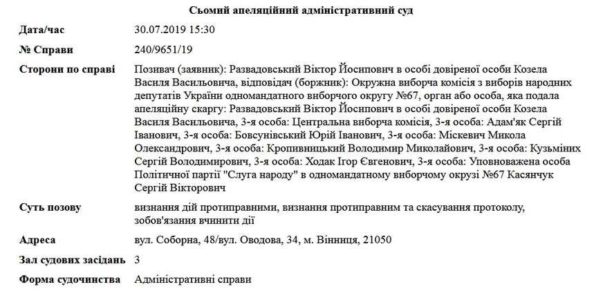 Сьомий апеляційний адміністративний суд, який знаходиться у Вінниці, 30 липня буде розглядати апеляційну скаргу кандидата в нардепи Віктора Развадовського на рішення Житомирського окружного адміністративного суду.