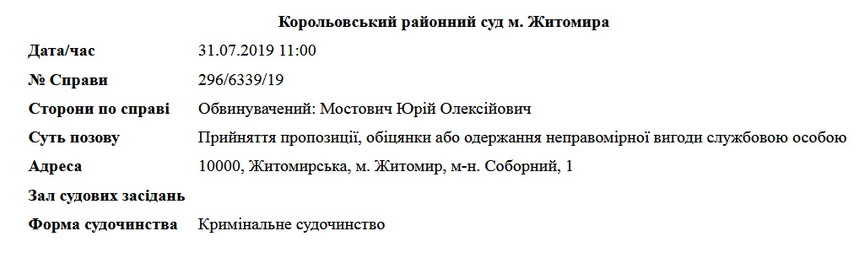 «До Корольовського районного суду м.Житомира 02.07.2019 року надійшов затверджений обвинувальний акт від 25.06.2019 року в кримінальному провадженні по обвинуваченню ОСОБА_1 за ч.3 ст.368 КК України», - йдеться в ухвалі суду.