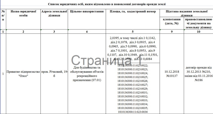 Інформація про відмову є у додатку до проєкту рішення «Про поновлення договорів оренди землі юридичним особам», який оприлюднений на сайті міської ради 2 серпня.
