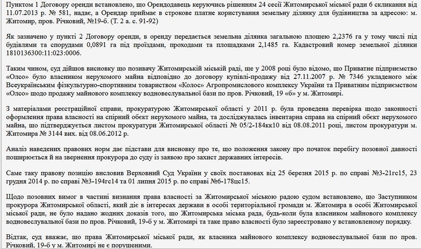 «Ухвалою Богунського районного суду м. Житомира від 14.08.2015 року по справі № 295/11675/15-ц заборонено Житомирській міській раді вчиняти дії щодо передачі земельних ділянок по пров. Річковому, 19-б в м. Житомирі у користування ПП «Олсо», заборонено ПП «Олсо» вчиняти дії щодо оформлення права користування земельними ділянками по пров. Річковому, 19-б у м. Житомирі», - таке пояснення до відмови надає міська рада.