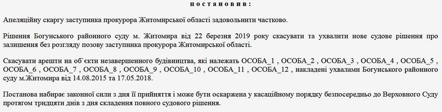 Станом на 5 серпня 2019 року це рішення Богунського райсуду законної сили не набрало, бо представники прокуратури оскаржили його в апеляційному суді. Постановою Житомирського апеляційного суду від 24 липня 2019 року апеляційну скаргу прокурора задоволено частково.