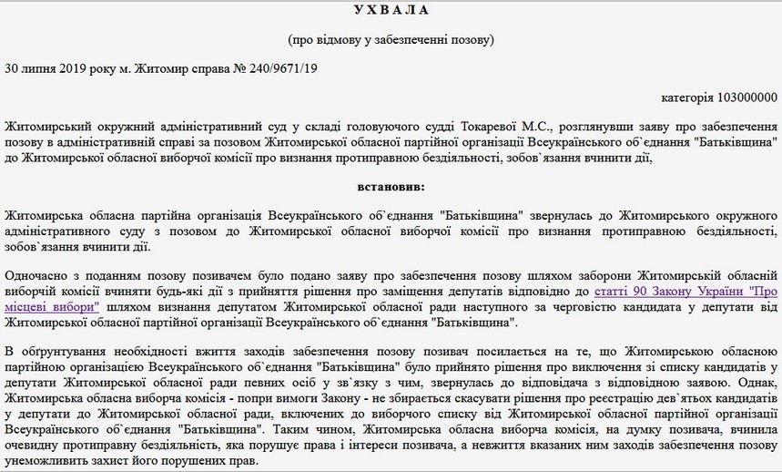 Однією ухвалою суд відкрив спрощене позовне провадження без повідомлення учасників справи, іншою ухвалою окружний адмінсуд відмовив позивачу у забезпеченні позову шляхом заборони Житомирській обласній виборчій комісії вчиняти будь-які дії з прийняття рішення про заміщення депутатів відповідно до статті 90 Закону України «Про місцеві вибори» шляхом визнання депутатом Житомирської обласної ради наступного за черговістю кандидата у депутати від Житомирської обласної партійної організації Всеукраїнського об`єднання «Батьківщина».