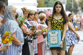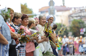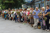 Парафіяни ПЦУ вишиковуються на пішохідній Михайлівській, бо у дворі Свято-Михайлівського собору роблять ремонт. Із благоговінням приймають окроплення свяченою водою і вітають одне одного зі святом.
