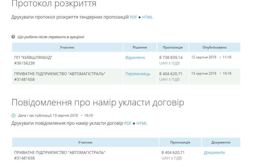 Найвигіднішою виявилась пропозиція ПП «Автомагістраль» у 8,4 млн грн. Тож наразі компанії повідомили про намір укласти з нею договір.