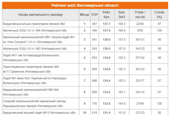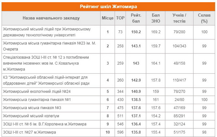 У п’ятірці кращих шкіл Житомира з найвищими балами ЗНО – три ліцеї, гімназія і школа №12, а Житомирської області – три школи Малина, Бердичівська гімназія та новоград-волинський ліцей: