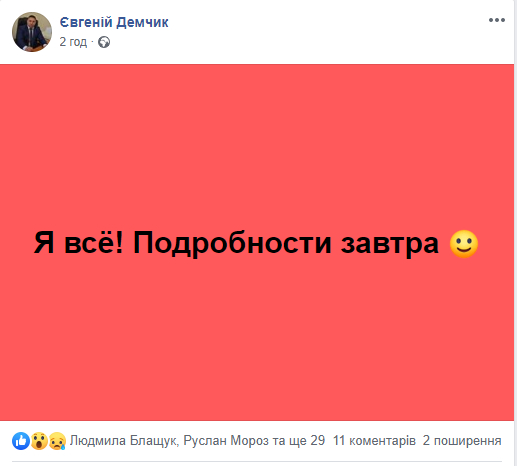 Сам начальник ТТУ не багатослівний у своїх коментарях з цього приводу. «Я все! Подробиці завтра», - написав Євгеній Демчик.