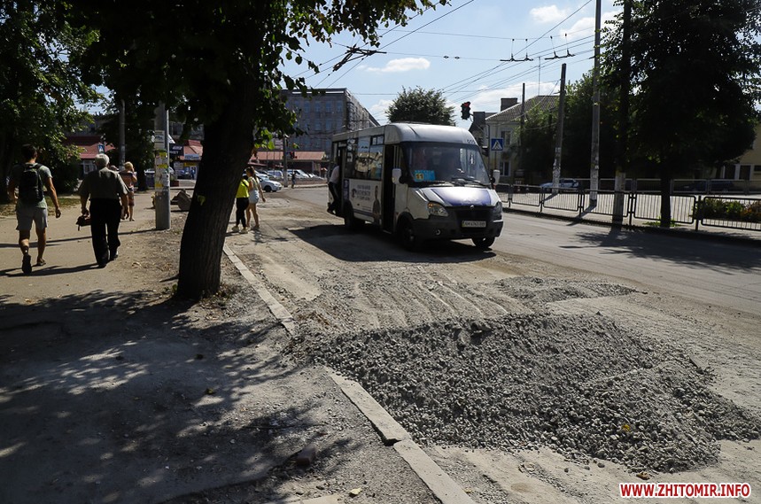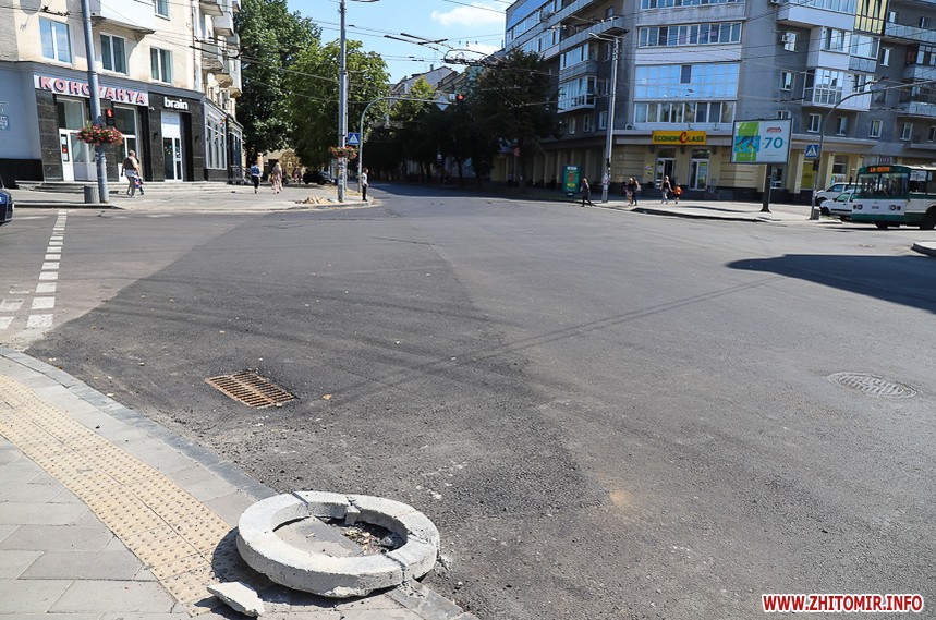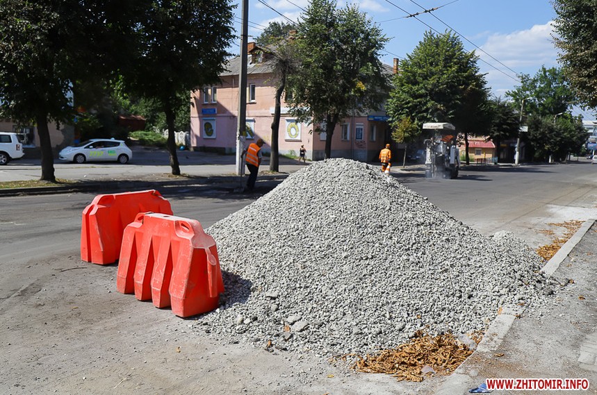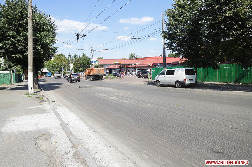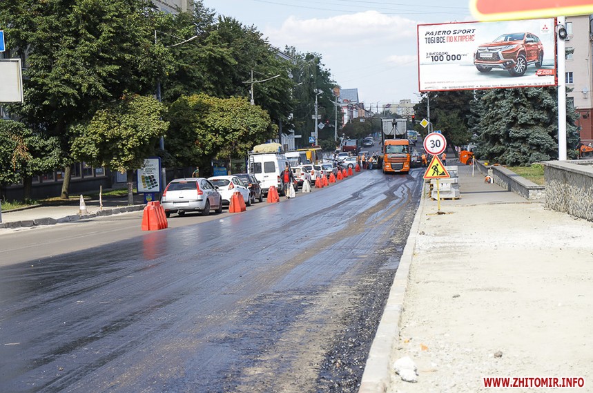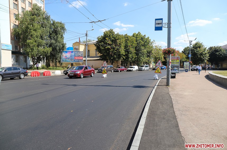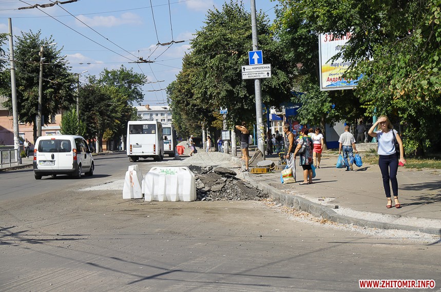 На вулиці Великій Бердичівській, де зрізати старий асфальт розпочали 12 липня, ремонтні роботи вже перебувають на завершальній стадії. Ділянка від майдану Соборного до будівлі міської ради може похизуватися гладенькою поверхнею. Тут ще подекуди стоять знаки, які попереджають про ремонтні роботи, проте рух уже відкритий по усіх смугах. Ближче до Старого бульвару на днях проводили заміну комунікацій, тож роботи по вкладанню асфальту тут ще попереду. Рух на даній ділянці обмежений, а для пасажирів громадського транспорту на зупинці розмістили оголошення про зміну руху маршрутів тролейбусів. Також лишається закритим проїзд у двір міської ради, де замінювали тепломережу.