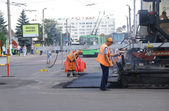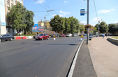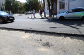 Одночасно ведуться роботи на вулиці Перемоги. Тут на ділянці до майдану Короленка знімають асфальт, демонтують бордюри, замінюють каналізаційні колодязі і вже на початку вулиці Перемоги почали вкладати свіженьке покриття на двох смугах руху.